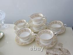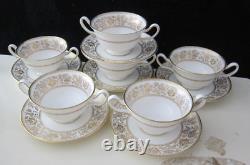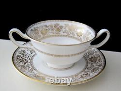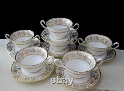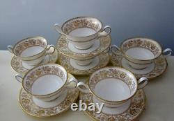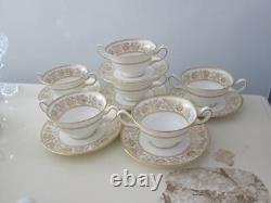 Here is for sale a Wedgwood Gold Damask pattern set of 6 bone china cream soup/ bouillon cup with 2 handles and 6 saucers. The cups are 4.5" in diameter, 2.5" high, like new condition, made in England. Instead, contact me to arrange the conditions. FEEDBACK: Almost all my items are vintage or antique and they can have different imperfections, so sometimes some imperfections can be overlooked. Even though I try to do my best.
