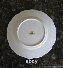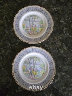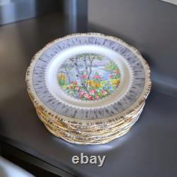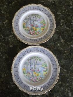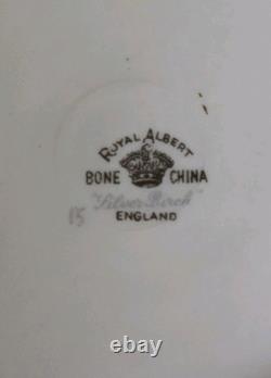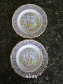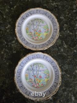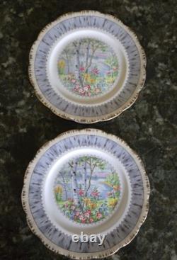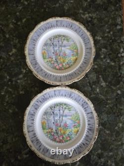 This 12-piece Royal Albert Porcelain Bone China salad lunch plate set in the Silver Birch pattern is a vintage collectible from England. The round plates feature a multicolor design with birch trees, flowers, and a lake theme, typical of traditional English style. The set includes 12 plates, ideal for serving salads or lunches in a charming countryside setting.