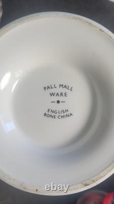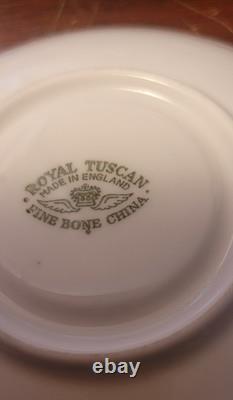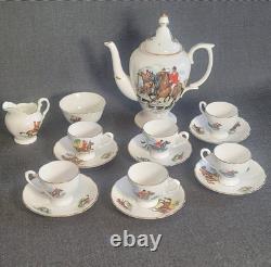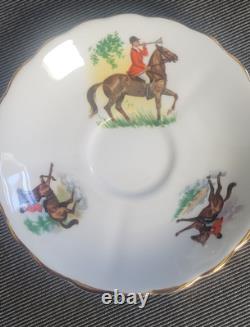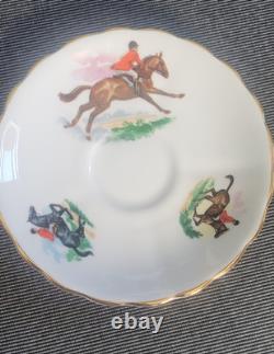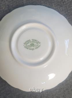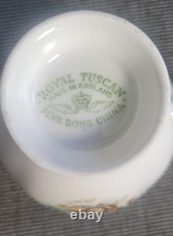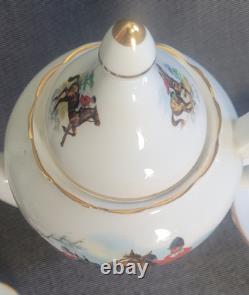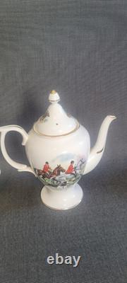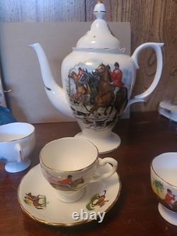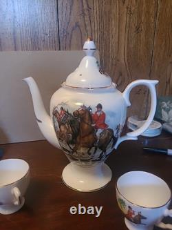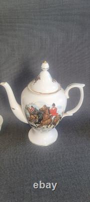 This beautiful bone china tea set is a vintage piece from England's Royal Tuscan collection. The set includes everything needed for a perfect tea party, with a multicolor horse pattern that adds a touch of elegance to any occasion. The porcelain material is of the highest quality, and the original design makes it a collector's item. Whether for use or display, this tea set is sure to impress. T pot is pall mall bone China while the cups and plates are royal tuscan.