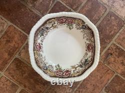 The Devonshire Johnson Brothers Vintage China Set is a 40-piece dinner set made in England in the early 20th century. This antique set featuring a Sheraton style with a vintage multicolor flower pattern is crafted from bone china using traditional pottery techniques. The set includes everything shown in the images. Some of the items have chips/scratches, will send photos upon offer.