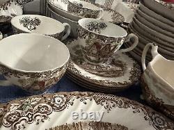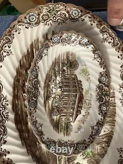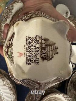 See pics for details nice lot has different patterns such as French providential, southern plantation, Pennsylvania fieldstone, colonial overhang, olde English countryside. The butter tray is missing the bottom and the gravy boat is cracked other than that they appear to be in good shape some will need to be wiped off as these were an estate find. I sell a lot of NOS which means new old stock items that's found in storage. Used items are just that used, some may require further cleaning, have signs of use, it is the buyers responsibility to review photos and make a decision on that. Please review photos as they are a major part of the item description.