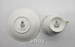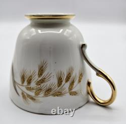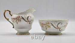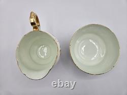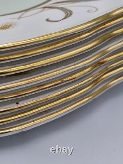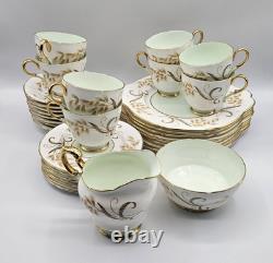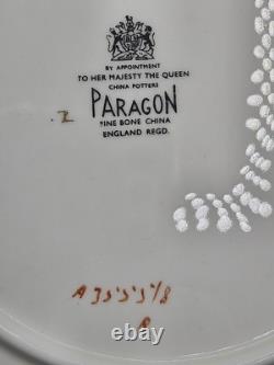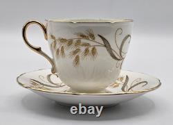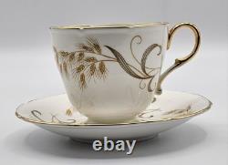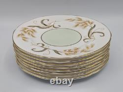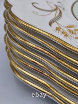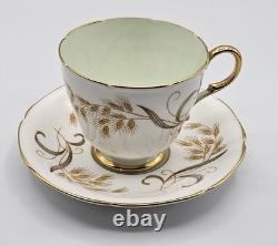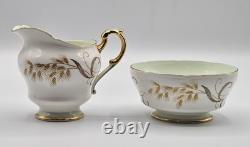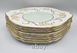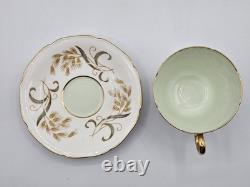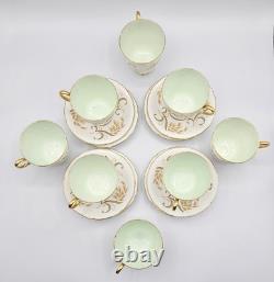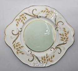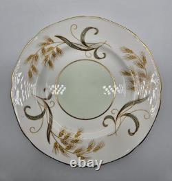 Paragon Wheat Pattern A3555 Mint Green Center Gold Gilded English Fine Bone China Tea Set for 8. Some fading in the gilding, but otherwise in excellent condition. 8 Luncheon Plates: 9.5" wide x 8.5" deep. 8 Bread and Butter plate: 5 15/16 wide. 1 Sugar Bowl: 4.5" wide x 2 1/4" tall.