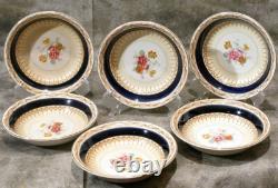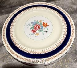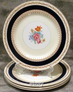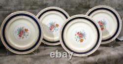 Elevate your dining experience with the rare Bleu de Roi, Sinclair pattern, by Alfred Meakin, Made in England, 16 piece fine porcelain china. Handcrafted with the utmost care in the United Kingdom, this exquisite collection features a timeless floral rose center design with cobalt blue band, accented with 22k gold trim that adds a touch of luxury to any table setting. Comprising 16 pieces, this partial set is made from high-quality bone china porcelain, ensuring durability and a fine finish. Perfect for those with a penchant for vintage or antique china, each piece showcases the renowned craftsmanship of the Alfred Meakin fine dining line, with a heritage that spans generations. Dinner and luncheon plates are in very good condition as seen in the pictures, with some light crazing. Stains and crazing on the small bowls. One small bowl has a rim chip as seen in the listing photos. Stains and crazing on the low pitcher and saucer. Four (4) dinner plates- 10 diameter.