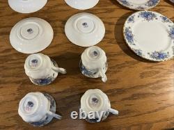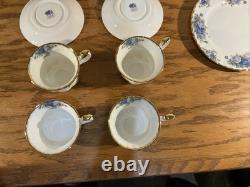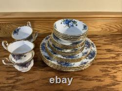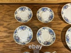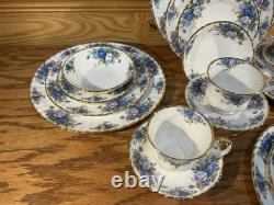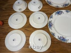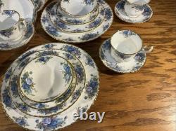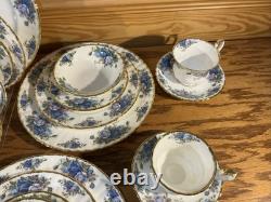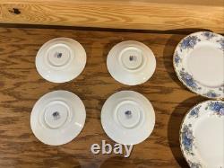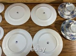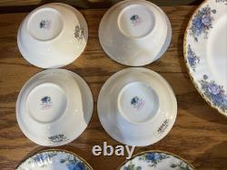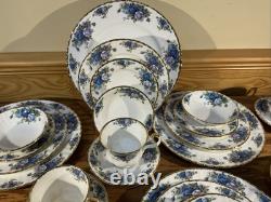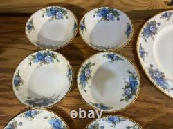 This is the most beautiful set of China I have ever seen. It has blue moonlight, cabbage roses with a heavy gold trim around all the fluted plates. Most of the items still have tags.