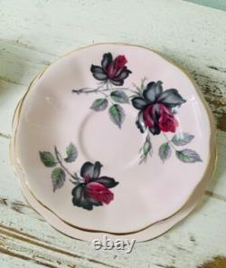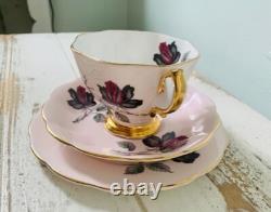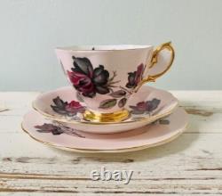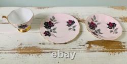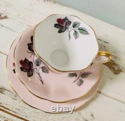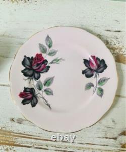 This vintage Royal Albert trio features a teacup, saucer, and plate with elegant black and red rose designs. Crafted from fine bone china for timeless appeal. Gold accents on handle and rims. Pink base with black and red rose patterns. Includes teacup, saucer, and plate.