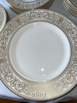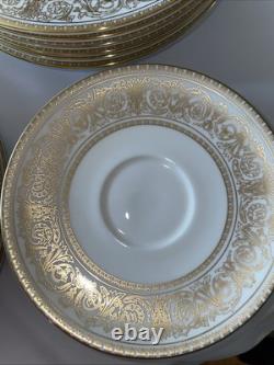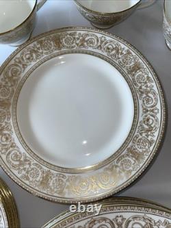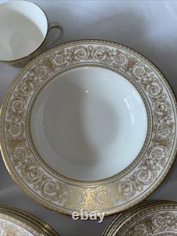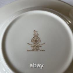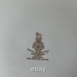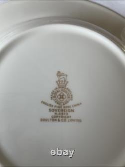 The Vintage Royal Doulton Sovereign Fine Bone China 6 Plate Sets & 4 Tea Cups H. 4973 is a luxurious and elegant set of dinnerware that exudes quality and sophistication. With its cream and gold color scheme and intricate Sovereign pattern, this collection is perfect for serving meals in style.