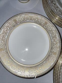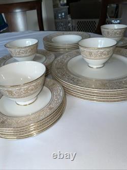 Made from fine bone china, the set is both durable and delicate, ideal for special occasions or everyday use. The vintage nature of the pieces adds a touch of nostalgia and charm to any dining experience, making it a sought-after addition for collectors of fine dinnerware. This set includes 6 dinner plates, 6 salad plates, 6 bowls, 6 bread dishes, 6 saucers and only 4 tea cups.