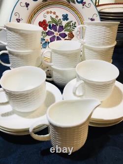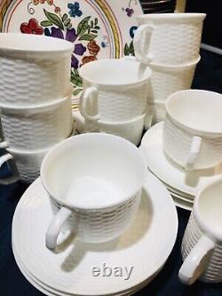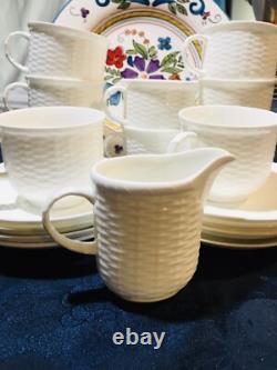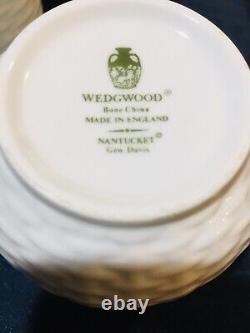 This set of 10 Wedgwood Bone China NANTUCKET cups, 8 saucers, and 1 creamer is a stunning addition to any collection. Made in England, these cups and saucers feature a beautiful white bone china material with a Nantucket pattern. The set is perfect for collectors or those looking to add a touch of elegance to their dining experience. The cups and saucers are ideal for serving tea or coffee, while the creamer adds a touch of sophistication to any table setting.