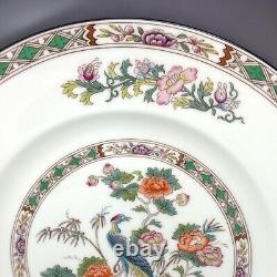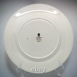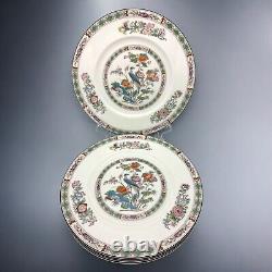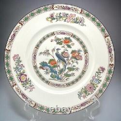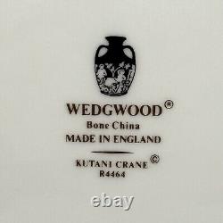 This is a set of four Wedgwood Kutani Crane dinner plates, each measuring 10.75 inches in diameter. Made of bone china in England during the late 20th century, these round plates feature a multicolor design with a glossy finish. The plates showcase a beautiful Asian-inspired theme with painted birds and bamboo, perfect for all occasions and adding a touch of elegance to any table setting.