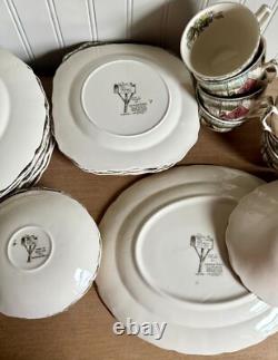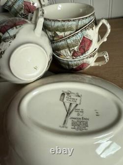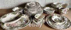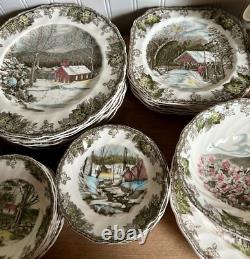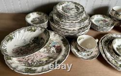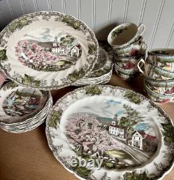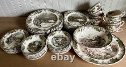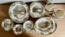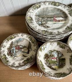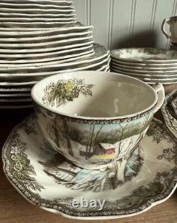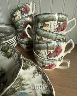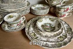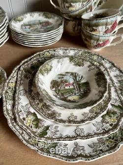 Vintage setting for 8 Johnson Bros Friendly Village Dinnerware. Beautiful Johnson Brothers Friendly village set made in England. This dinnerware set is complete with service for 8 and has beautiful individual winter scenes with brown floral rim edges on each piece. Each piece includes vivid colors along with great attention to detail. Each piece has their logo stamped on the backs.
