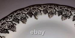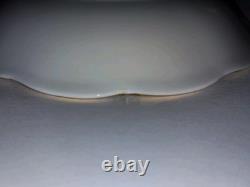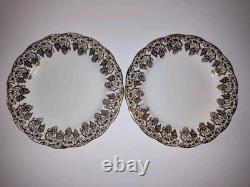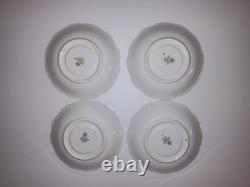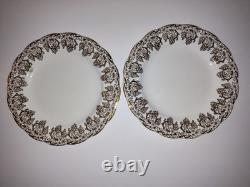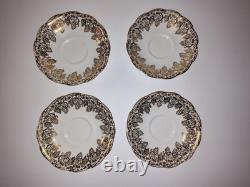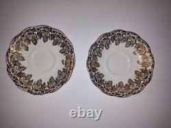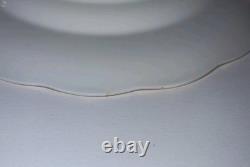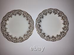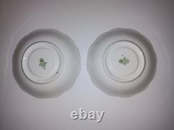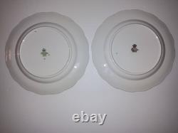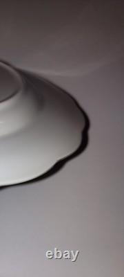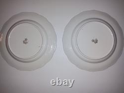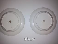 They're not really visible, but can be felt when running your finger around the rim. Saucers measure approximately 6" in diameter, luncheon plates measure approximately 8" in diameter.