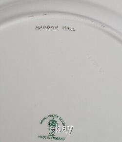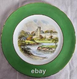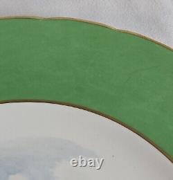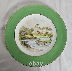Set of eight (8) Royal Crown Derby dinner plates. Green and gilt scalloped edge, center features famous British landmarks, such as Haddon Hall and Bakewell. Maker's mark in green underneath dates these plates to 1942.
