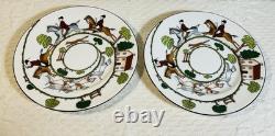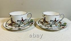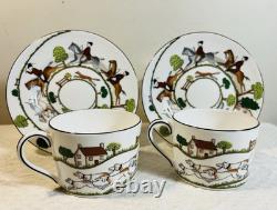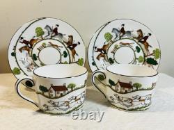 The Vintage Wedgwood Hunting Scenes Bone China Teacup & Saucer Set is a beautifully crafted collectible piece made in England. Featuring a classic animal print pattern in multicolor, this set includes a teacup and saucer, both made from fine bone china by the renowned brand Wedgwood. This set would make a lovely addition to any collector's kitchen or dining room, showcasing the quality craftsmanship and timeless elegance of British dinnerware. Set includes two cups and two saucers. Cups measure 3.25" across and 2.75"H.