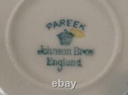 This is a nice Vintage Possibly Antique Pareek Johnson Bros. England Porcelain Set of 8 Cups & Saucer with Pheasant Decorations with an extra saucer. The dimensions of the cups are 3 1/4" long x 2 3/8" wide x 2 5/8" tall and the saucers are 4 5/8" in diameter.