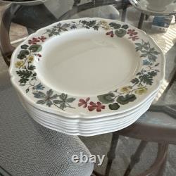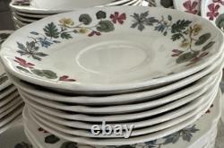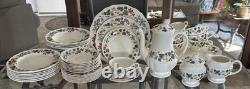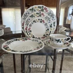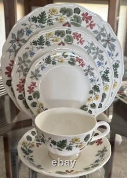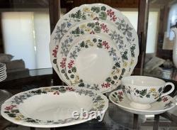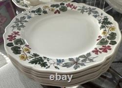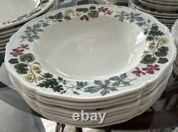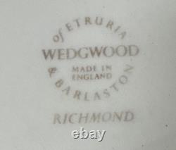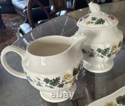 We are offering for sale a rare vintage Wedgwood dining set called Richmond. It is white porcelain w/ multicolored leaves & flowers along the rim, and features lightly scalloped edges. This pattern was in production for a limited timeframe between 1968-73. In addition to the 8 place settings, we also have a coffee pot w/ lid, creamer & sugar w/ lid & 14 oval serving platter.
