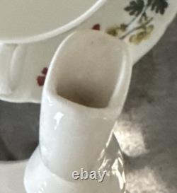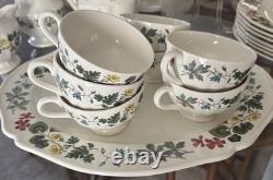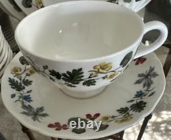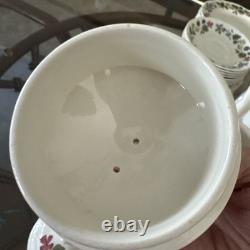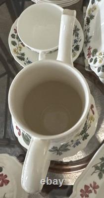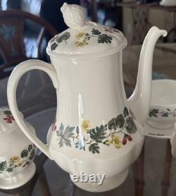 The white porcelain has a floral & leaf pattern in dark pink, yellow, blue, brown & shades of green. The finials atop the coffee pot and sugar bowl resemble a floral bud. This 52-piece set will be a beautiful addition to any dining table, showcasing the craftsmanship and classic design of Wedgwood.