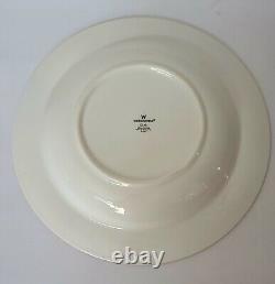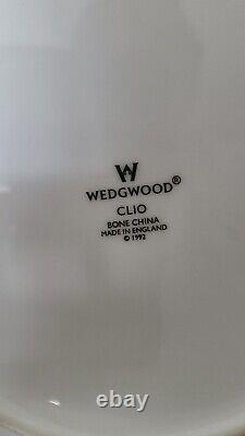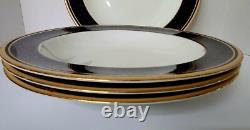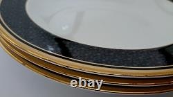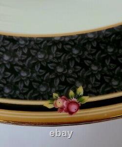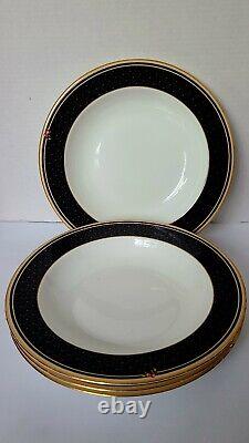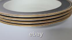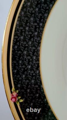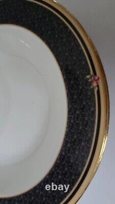 This set of four 11 diameter soup plates from Wedgwood's Clio product features black rim of tiny gray roses on a black background with gilded sides and two accent pink roses. In a great Vintage condition. No chips or cracks or scratches on the plates. Some gilding loss on the outer rim.