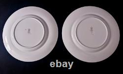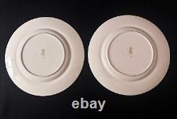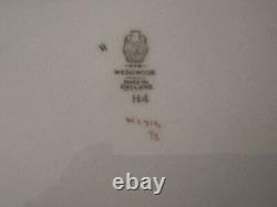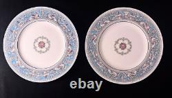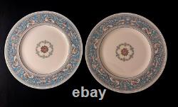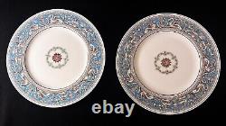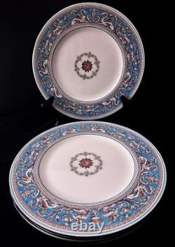 This is a set of six Wedgwood bone china dinner plates in the Florentine Turquoise pattern which is a unique dragon design. This pattern was first produced in 1931 in England and has been one of the most popular patterns. The dinner plate has a diameter of 10 & 3/8 inches and there are no chips, nicks or cracks. However, the plates have been used and there are utensil marks throughout the white area and some wear to the interior black rim.