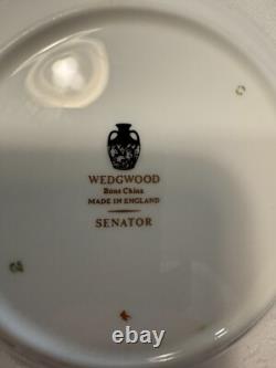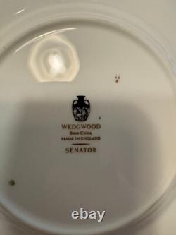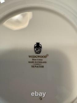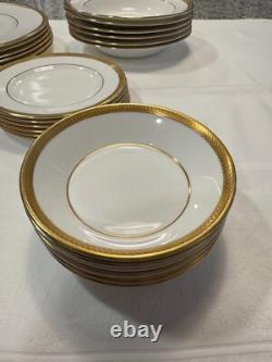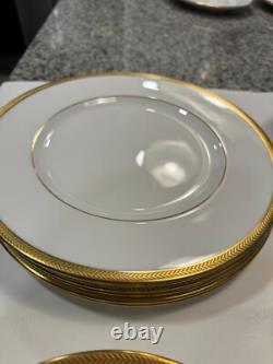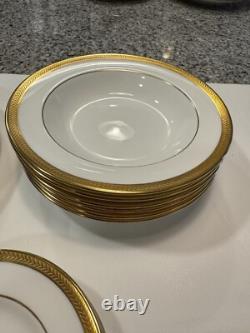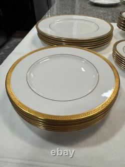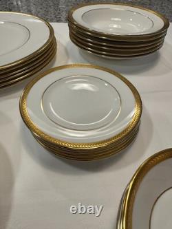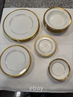 Set includes 6 dinner plates, 6 salad/dessert plates, 6 bread & butter plates, 6 rim soup bowls and 6 fruit bowls. This classic gold encrusted laurel band dinnerware set is exceptional and rare to find with all 30 pieces together. There are no chips or cracks or damage.